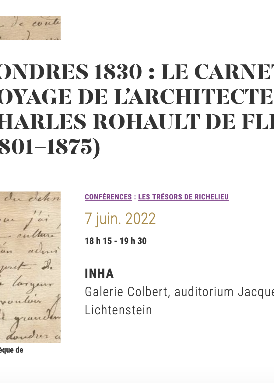 Julien Brault, Sophie Descat Londres 1830 : le carnet de voyage de l’architecte Charles Rohault de Fleury Conférence, cycle « Les Trésors de Richelieu », juin 2022
